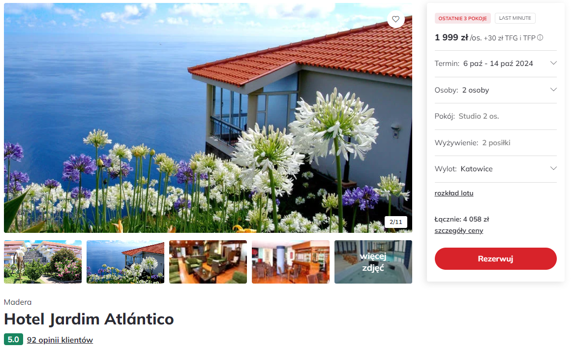 Urlop spędzisz w malowniczo położonym 4* hotelu Jardim Atlantico. Piękna lokalizacja tuż nad oceanem oznacza zapierające dech w piersiach widoki oraz kołyszący do snu szum fal. Obiekt znajduje się w pobliżu znanego górskiego szlaku Levada Nova.