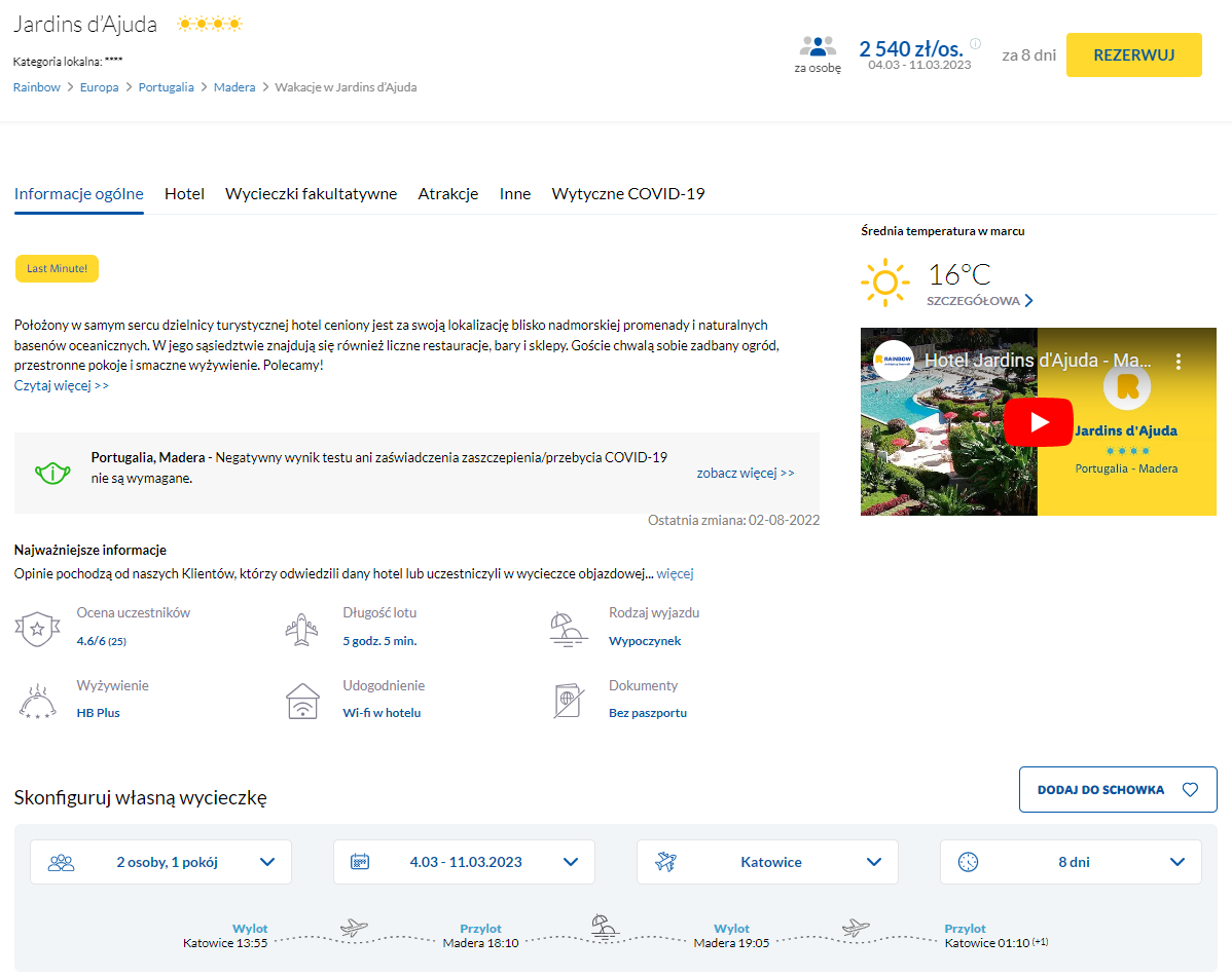 Na wyspę wiecznej wiosny polecisz w terminie 4 – 11 marca. Czeka cię bezpośredni lot do Funchal z wliczonym bagażem rejestrowanym, a jako miejsce wylotu możesz wybrać Katowice, Poznań lub Warszawę.