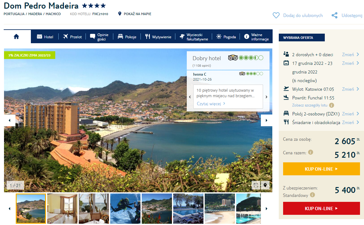 Tym razem macie sporo czasu na spakowanie się, bowiem wczasy w Portugalii zaplanowane zostały w terminie 17 – 24 grudnia. Na początek czeka was bezpośredni lot z Warszawy lub Katowic do Funchal, realizowany na pokładzie samolotu linii lotniczej Enter Air. W cenę pakietu wliczono bagaż rejestrowany (nadawany do luku).