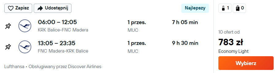 Podróżując w obie strony, czekać cię będą przesiadki Frankfurcie lub Monachium. W cenę biletu wliczony jest bagaż podręczny i przedmiot osobisty.