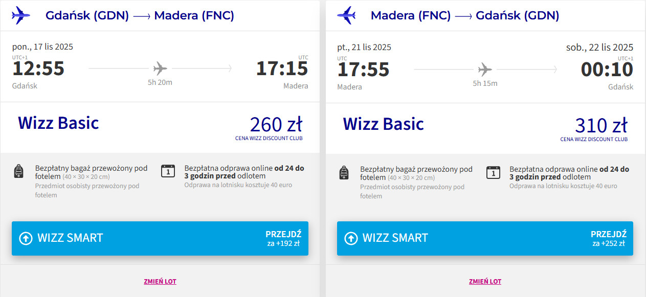 Na Maderę możesz także polecieć bezpośrednio… z Gdańska linią Wizz Air. Tylko pamiętaj, że bilety w najniższej cenie dostępne są dla członków Wizz Discount Club. Chętni na loty bez WDC zapłacą 634 PLN (w obie strony).