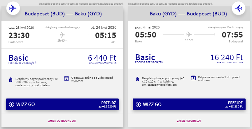 Na wycieczkę wybierzecie się 23 kwietnia z Warszawy do Budapesztu. W stolicy Węgier czeka was 16 godzin przerwy w podróży (to idealna okazja na szybkie zwiedzanie Budapesztu) i wieczorny lot do Baku, gdzie wylądujecie następnego dnia rano. W drogę powrotną z Azerbejdżanu do stolicy Węgier polecicie 4 maja, aby po jednym dniu w Budapeszcie wrócić do Warszawy.