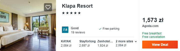 Na Bali rekomenduję wam noclegi w komfortowym 5* hotelu Klapa Resort. Obiekt zlokalizowany jest w pobliżu plaży. Każdy pokój ma wygodne łóżko, prywatną łazienkę i balkon z widokiem na okolicę. Poza tym otrzymacie darmowe śniadania.