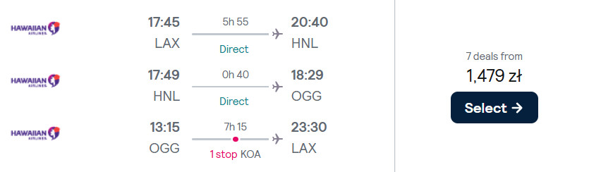 Uzupełnieniem podróży są loty krajowe na trasie Los Angeles-Honolulu-Kahului-Los Angeles. Całą trasę pokonasz samolotami linii Hawaiian Airlines.