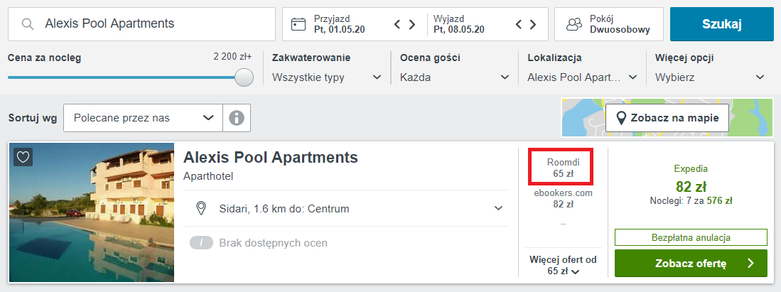 Na wyspie proponuję zdecydować się na zakwaterowanie w pensjonacie Alexis Pool Apartments. Czekają tam na was prosto urządzone pokoje z prywatną łazienką, aneksem kuchennym oraz dostępem do bezpłatnego WiFi. W celu uzyskania ceny 454 PLN/7 dni wybierzcie pośrednika Roomdi.