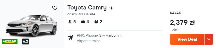 Odległości w USA są znaczne, dlatego zachęcam cię do wypożyczenia samochodu po przylocie do Phoenix. Mając do swojej dyspozycji auto, łatwo i wygodnie dojedziesz w okolice głównych atrakcji stanu Arizona i nie tylko.