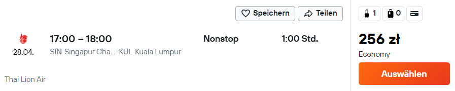 Przygotowana przeze mnie podróż składa się z dwóch niezależnych rezerwacji. Pierwszą jest przelot linią Air China na trasie: Warszawa-Singapur oraz Kuala Lumpur-Pekin-Warszawa, natomiast drugą jest lot linią Thai Lion Air pomiędzy Singapurem a stolicą Malezji.