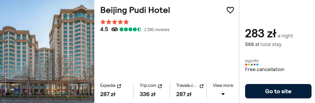 Natomiast w Pekinie rekomenduję ci noclegi w 5* hotelu Beijing Pudi z krytym basenem. Znajduje się on w odległości 5 minut spacerem od stacji metra Jianguomen, skąd dojedziesz do Zakazanego Miasta.