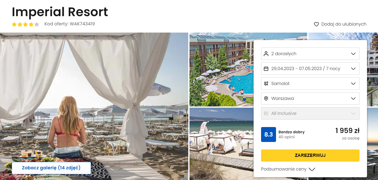W cenę pakietu wliczono podróż z bagażem podręcznym, podstawowe ubezpieczenie i wyżywienie w formule all inclusive+ (śniadanie, obiad, kolacja w formie bufetu, napoje alkoholowe i bezalkoholowe oraz przekąski, kawa, herbata, ciasto, lody).