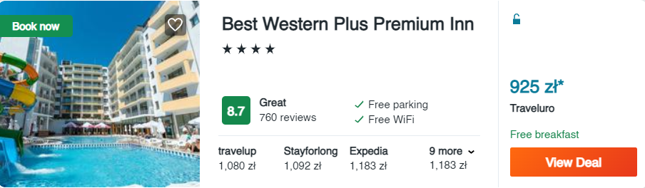 W Słonecznym Brzegu wybrałam dla was 4* hotel Best Western Plus Premium Inn, który cieszy się świetnymi opiniami wśród dotychczasowych gości. Do jego zalet należą m.in. komfortowe pokoje, basen ze zjeżdżalniami i leżakami oraz lokalizacja. Co więcej, w cenę pobytu wliczono smaczne śniadania.