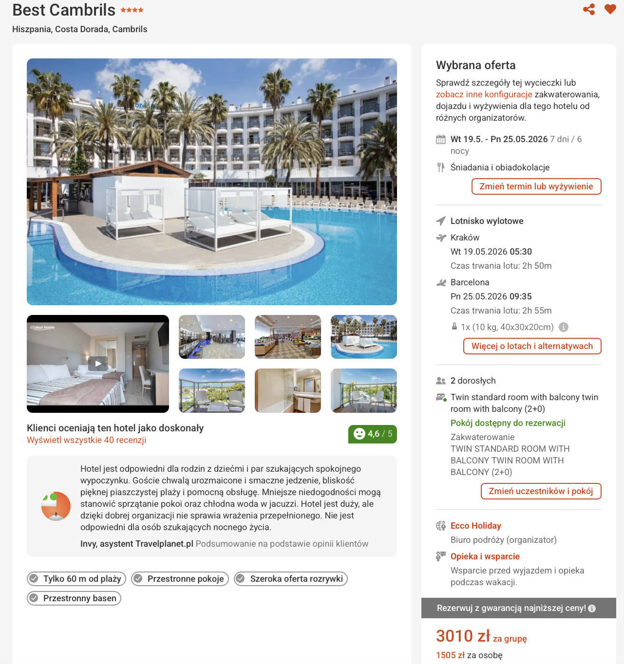 Hotel Best Cambrils znajduje się zaledwie 60 metrów od plaży. Goście chwalą lokalizację obiektu, przestronne pokoje z balkonami oraz duży basen otwarty z brodzikiem dla dzieci. Doceniają także bogatą ofertę rozrywki, w tym programy animacyjne, miniklub dla najmłodszych oraz wieczorne występy na żywo. Do dyspozycji gości jest strefa fitness, wypożyczalnia rowerów, kort tenisowy i plac zabaw. Hotel dysponuje restauracją, kawiarnią oraz barem przy basenie.