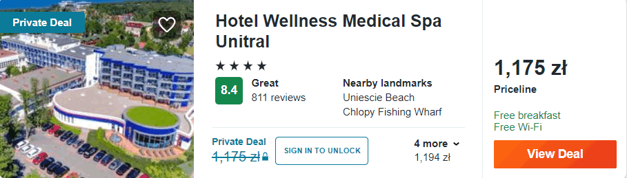 Także nad Bałtykiem, ale w Mielnie, znajduje się 4* hotel Wellness Medical Spa Unitral. W cenie zakwaterowania wliczone są codzienne śniadania. Ponadto będziecie mogli korzystać z sieci WiFi, krytego basenu oraz centrum fitness. W każdym pokoju jest łazienka z prysznicem.