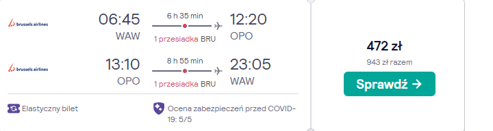 Na wycieczkę do Porto polecicie w gorącym terminie przyszłorocznej majówki: 28 kwietnia – 4 maja. Czekają was loty z warszawskiego lotniska im. Fryderyka Chopina na pokładzie samolotów Brussels Airlines z bezpiecznymi, gwarantowanymi przez przewoźnika przesiadkami w Brukseli.