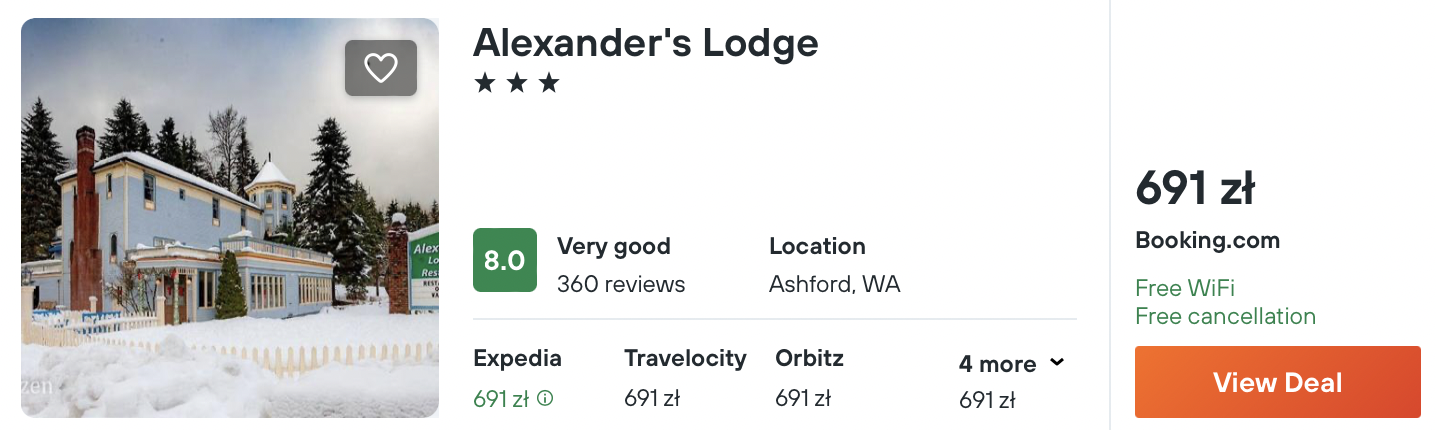 Natomiast w Parku Narodowym Olympic wybrałem dla ciebie noclegi w 3* obiekcie Olympic Lodge. Dotychczasowi goście rewelacyjnie oceniają pobyt w tym miejscu. W cenę wliczono śniadania.