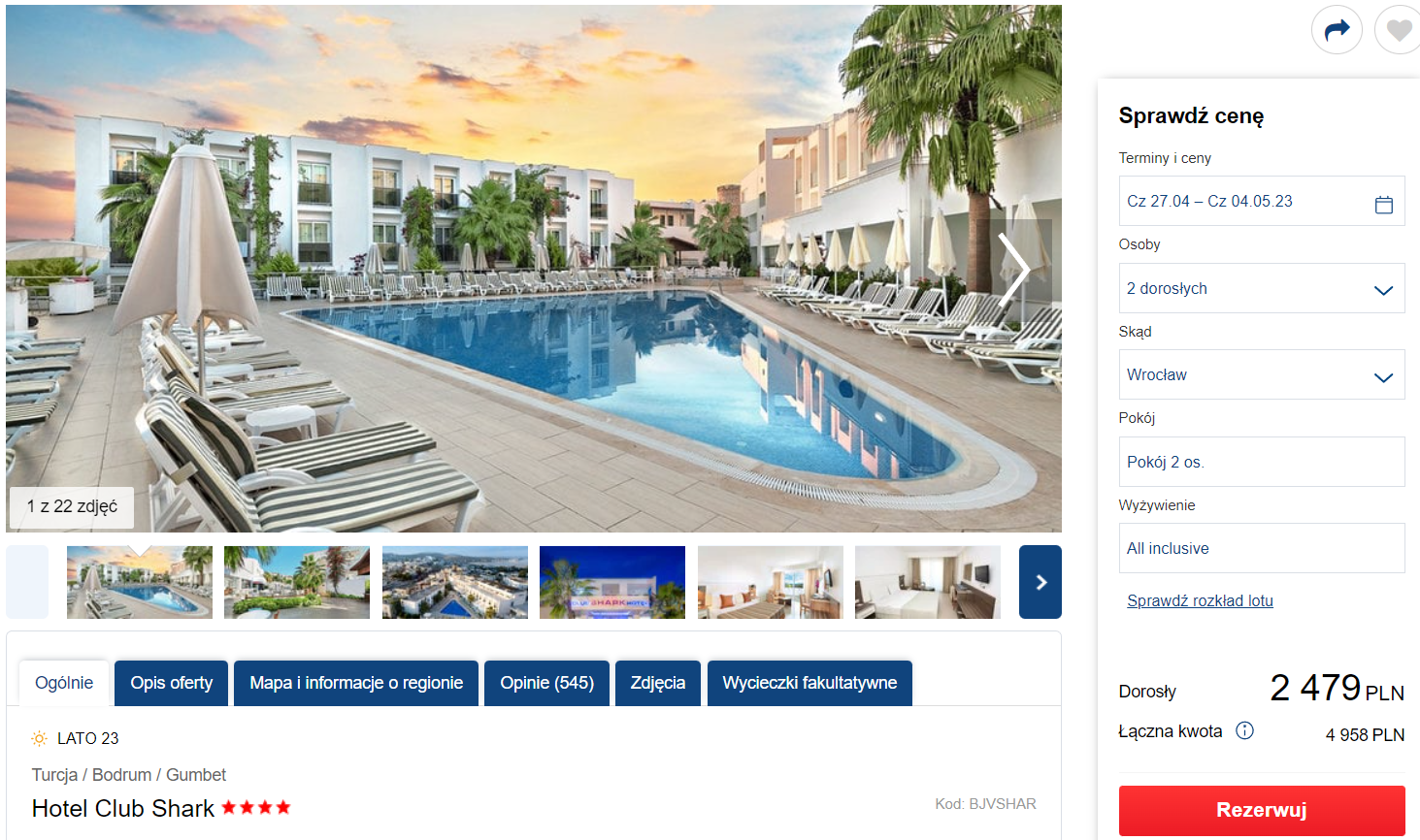 Urlop spędzisz w bardzo dobrym 4* hotelu Club Shark. Na terenie obiektu dostępny będzie basen zewnętrzny z tarasem słonecznym. Skorzystasz również z sauny, siłowni i łaźni tureckiej. W twoim pokoju znajdziesz TV, WiFi, balkon i prywatną łazienkę. W cenę wliczono wyżywienie w formule all inclusive.