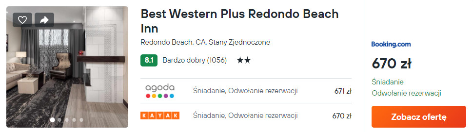 Natomiast nieopodal plaży Redondo rekomenduję ci noclegi (ze śniadaniami) w hotelu Best Western Plus Redondo Beach Inn, z odkrytym basenem. Na miejscu zapewniony będziesz miał dostęp do sieci WiFi oraz bezpłatnego parkingu.