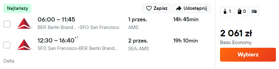 Do Las Vegas, Los Angeles, San Francisco oraz Seattle udasz się z Berlina, na przełomie kwietnia i maja. Do Stanów Zjednoczonych polecisz liniami Air France, Delta Air Lines oraz KLM, z wygodnymi przesiadkami na terenie EU, Kanady oraz USA.