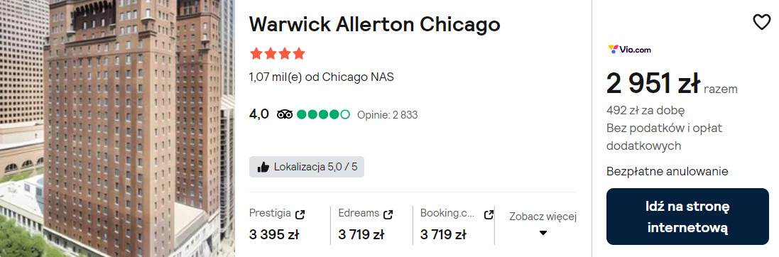 Na miejscu zatrzymasz się w 4* hotelu Warwick Allerton Chicago, który znajduje się w samym sercu dzielnicy Magnificent Mile. Z lotniska w okolice miejsca noclegowego (przystanek Clark/Lake) dojedziesz komunikacją publiczną.