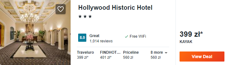 W Los Angeles proponuję wam noclegi w 3* hotelu Hollywood Historic. To świetnie oceniany obiekt, który zlokalizowany jest w pobliżu słynnego napisu. Wasz pokój wyposażony będzie m.in. w: TV, duże łóżko i prywatną łazienkę.