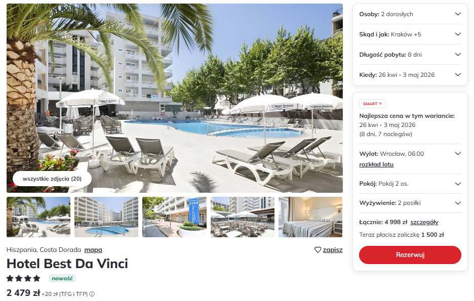 W cenie oferty otrzymujesz przeloty w obie strony, dwa posiłki dziennie, bagaż podręczny i rejestrowany oraz podstawowe ubezpieczenie. Na miejscu warto skorzystać z możliwości wycieczki do pobliskiego parku rozrywki PortAventura World, oddalonego zaledwie kilka kilometrów od hotelu.