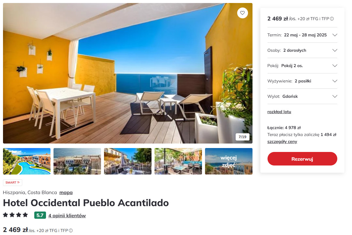 Na wybrzeżu Costa Blanca zatrzymasz się w bardzo dobrym 4* hotelu Occidental Pueblo Acantilado, z odkrytym basenem. Obiekt położony jest na szczycie klifu El Campello, w miejscowości Cala d’Or. Każdy apartament składa się z aneksu kuchennego, salonu, sypialni, łazienki oraz balkonu.