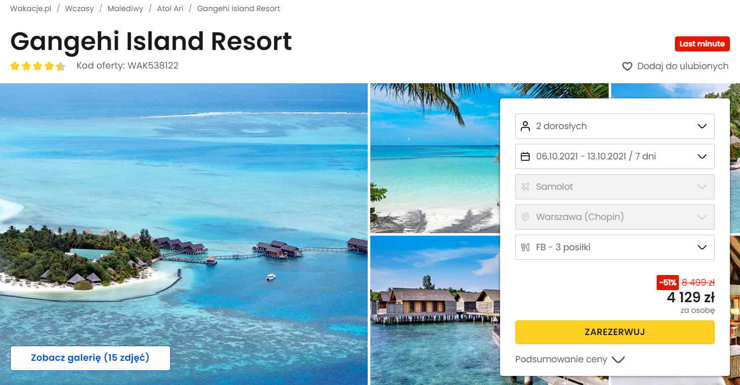 Na Malediwy wybierzecie się w terminie 6 – 13 października. Na miejscu zatrzymacie się w 4* Gangehi Island Resort z wyżywieniem w formule FB (3 posiłki) na rajskim atolu Ari. W resorcie do dyspozycji gości oddano m.in. kilka tematycznych restauracji, spa & wellness, siłownię oraz prywatną plażę z bezpłatnymi parasolami, leżakami i ręcznikami.