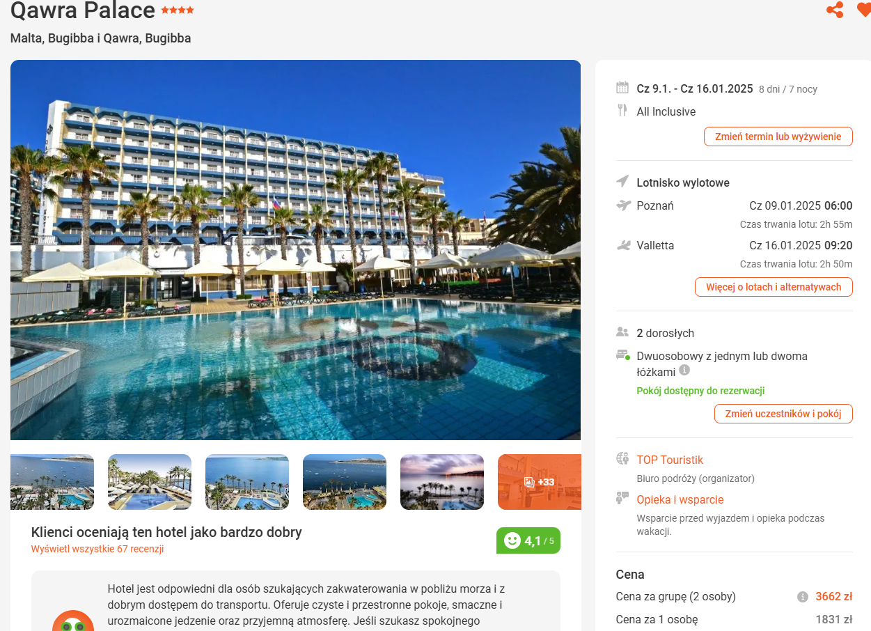 Na Maltę wybierzesz się w terminie 9 – 16 stycznia. Na wyspę polecisz bezpośrednio z Poznania. W cenę pakietu wliczone jest podstawowe ubezpieczenie, transfery z lotniska do hotelu i all inclusive.