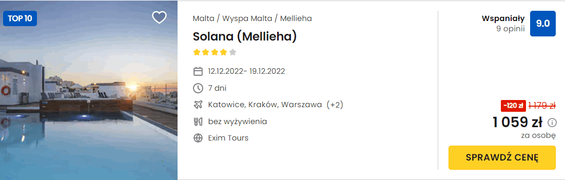 Na Malcie zatrzymasz się w bardzo dobrym 4* hotelu Solana, który znajduje się na północnym wybrzeżu wyspy. Na jego terenie mieści się odkryty basen z tarasem na dachu, kryty basen, centrum fitness oraz spa. Każdy pokój został wyposażony w klimatyzację z funkcją ogrzewania, telewizor LCD, minibar oraz czajnik elektryczny. We wszystkich pomieszczeniach możesz korzystać z dostępu do sieci WiFi.