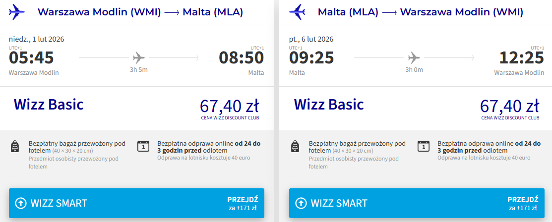 Na Maltę polecisz z Warszawy (Modlin) lub Katowic. Czeka cię bezpośredni lot z Wizz Air. Najtańsze bilety kupią członkowie Wizz Discount Club, pozostałe osoby zapłacą nieco więcej.