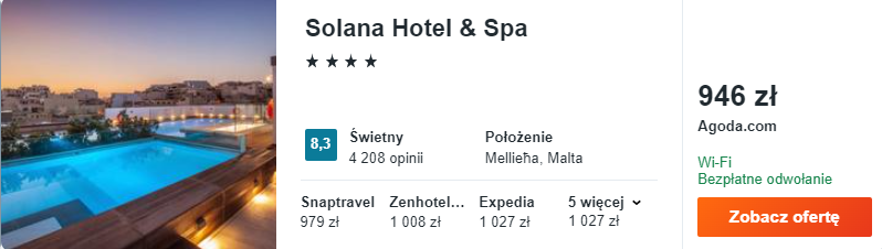 Na Malcie wybrałem dla was zakwaterowanie w 4* Solana Hotel & Spa. Na dachu obiektu znajduje się basen z podgrzewaną wodą, z którego roztacza się panoramiczny widok na okolicę.