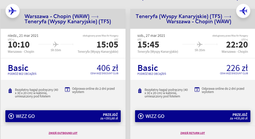 Na hiszpańską wyspę udacie się ze stołecznego lotniska im. Chopina w drugiej połowie marca, w terminie obejmującym pierwszy dzień wiosny. W obie strony podróżować będziecie samolotami węgierskiej linii lotniczej Wizz Air z wliczonym małym bagażem podręcznym. Najtańsze bilety kupią członkowie Wizz Discount Club, chętni na bilety bez WDC zapłacą nieco więcej.