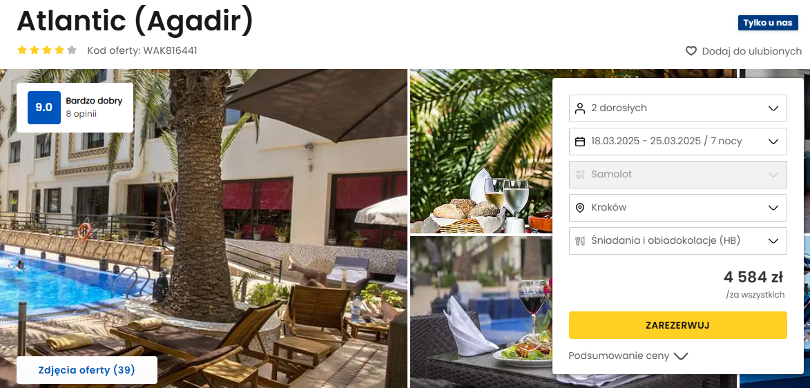 Do Afryki udasz się w terminie 18 – 25 marca. Czeka cię bezpośrednia podróż z Krakowa lub Wrocławia do Agadiru linią Ryanair. Bez dodatkowych opłat możesz zabrać bagaż podręczny. W pakiecie zawarte są przeloty, transfery z lotniska do hotelu, podstawowe ubezpieczenie oraz śniadania i obiadokolacje.
