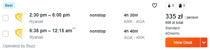 Na wypoczynek udacie się w terminie 22–29 maja. Do Agadiru polecicie z krakowskiego lotniska w Balicach. W obie strony podróżować będziecie bezpośrednio na pokładach samolotów linii Ryanair z wliczonym małym bagażem podręczny.