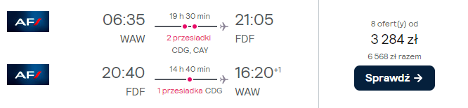 Wyjazd na Martynikę zaplanowano w terminie 19 – 29 listopada. Czekają cię loty z Warszawy, realizowane na pokładzie samolotów linii lotniczej Air France. Po drodze zaplanowano bezpieczne, gwarantowane przez przewoźnika przesiadki w Paryżu.