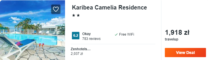 Na wyspie polecam wam noclegi w hotelu Karibea Camelia Residence, który znajduje się nieopodal plaży Anse Mita. Zakwaterowani będziecie w dwuosobowym pokoju wyposażonym w aneks kuchenny, telewizor LCD oraz klimatyzację. W łazience znajduje się prysznic oraz suszarka do włosów. Na miejscu zapewniony będziecie mieli dostęp od sieci WiFi, tarasu słonecznego oraz odkrytego basenu.