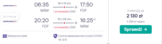 W podróż na Karaiby udacie się z warszawskiego lotniska im. Fryderyka Chopina w terminie 11 – 18(19) stycznia. Czekają was loty na pokładzie samolotów linii lotniczej Air France z bezpiecznymi, gwarantowanymi przez przewoźnika przesiadkami w Paryżu.