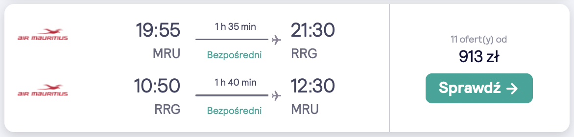 Twoja wycieczka rozpocznie się 7 marca na lotnisku im. Fryderyka Chopina w Warszawie, kiedy to polecisz na Mauritius. Po drodze zaplanowano bezpieczną przesiadkę w Paryżu. W dniach 10-17 marca bezpośrednim lotem udasz się na Rodrigues lub Reunion. Powrót do Polski zaplanowano na 20 marca.
