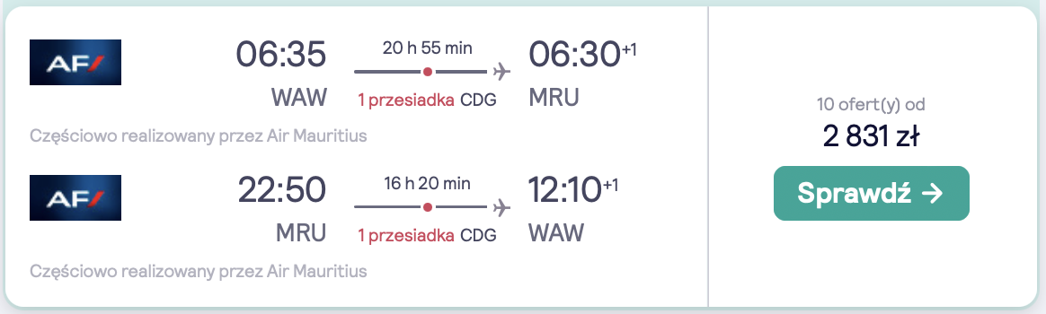 Podróżować będziesz na pokładach samolotów linii lotniczej Air France i Air Mauritius lub Air Austral. Bez dodatkowych kosztów będziesz mógł zabrać ze sobą mały bagaż podręczny.
