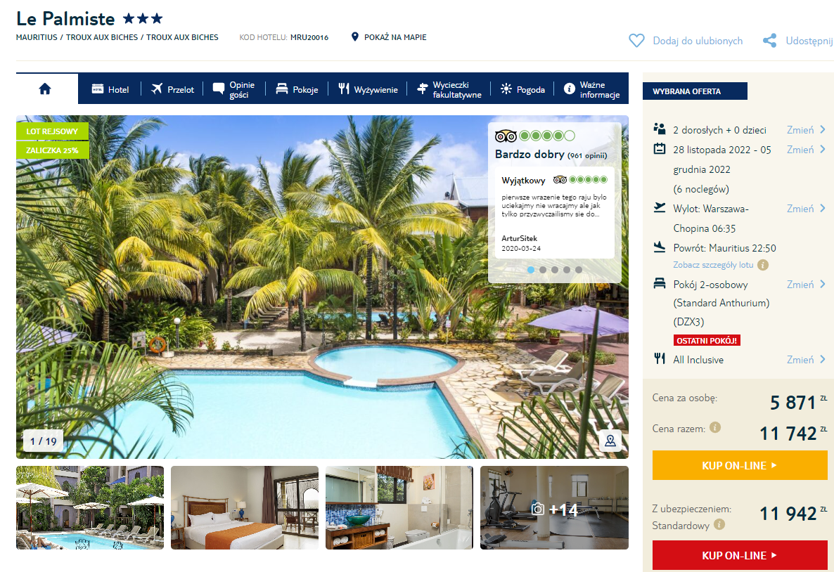 Urlop spędzicie w świetnym 3* hotelu La Palmiste. Położony w otoczeniu ogrodu palmowego, tuż przy plaży, oferuje komfortowe zakwaterowanie w klimatyzowanych pokojach. Do dyspozycji gości oddano kompleks odkrytych basenów oraz restaurację serwującą specjały kuchni kreolskiej i międzynarodowej w wydaniu all inclusive. Wieczorem zaplanowano program rozrywkowy z muzyką na żywo.