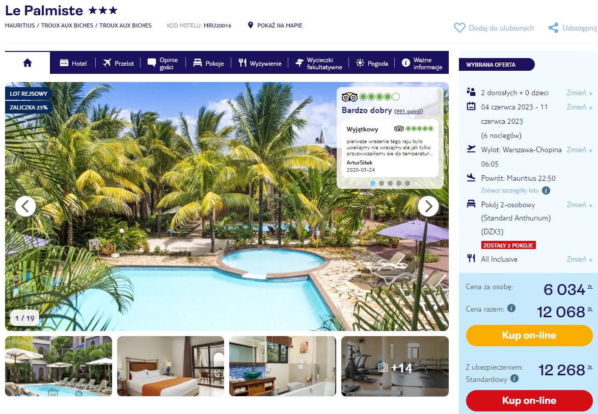 Wczasy spędzisz w świetnym 3* hotelu La Palmiste. Znajduje się on niedaleko plaży, w otoczeniu ogrodu palmowego. Dla gości przygotowano tam komfortowe noclegi w klimatyzowanych pokojach. Na miejscu będzie okazja zrelaksować się w kompleksie odkrytych basenów oraz spróbować lokalnych pyszności w restauracji serwującej specjały kuchni kreolskiej i międzynarodowe – oczywiście w wydaniu all inclusive!