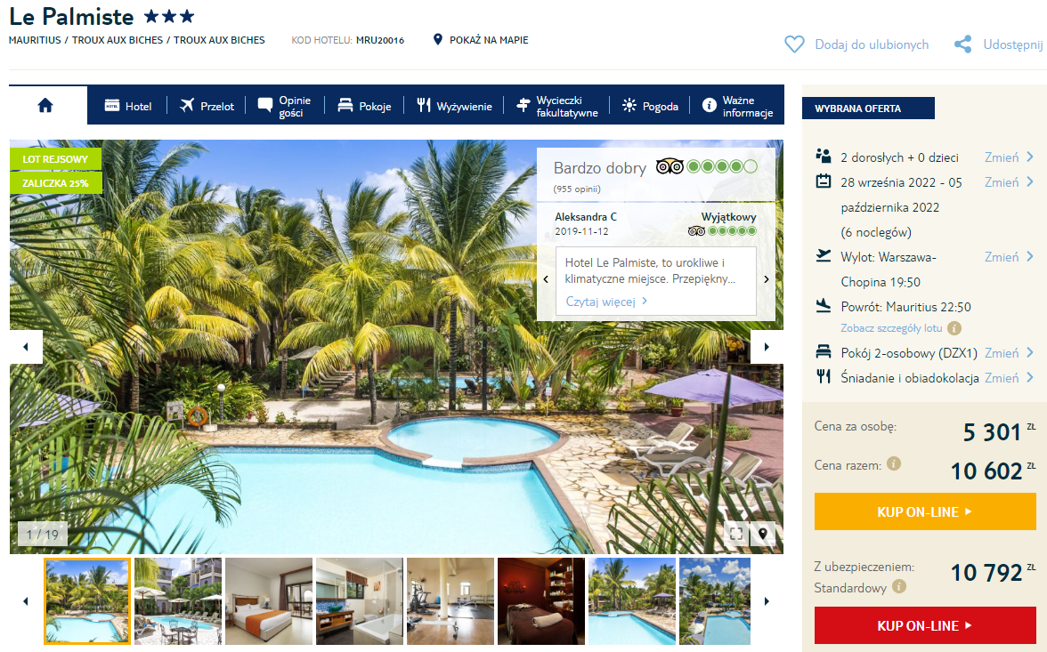 Wczasy spędzicie w świetnie ocenianym 3* hotelu La Palmiste. Znajduje się on w otoczeniu zielonego ogrodu palmowego i będzie doskonałym miejscem na wypoczynek. Do dyspozycji gości oddano kompleks odkrytych basenów, nowocześnie urządzone, klimatyzowane pokoje oraz restaurację z wliczonymi śniadaniami oraz obiadokolacjami.