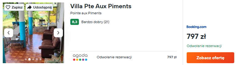 Wybrałem noclegi w kameralnym pensjonacie Villa Pte Aux Piments. Będzie to dobry kompromis między niską ceną, a oferowaną jakością i w zupełności wystarczy na tygodniowy urlop.
