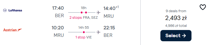 Do Afryki wybierzesz się w terminie 20(21) – 30(31) stycznia. Czeka cię podróż z Berlina na Mauritius na pokładzie Austrian Airlines oraz Lufthansy. Po drodze przesiądziesz się we Frankfurcie oraz Wiedniu (zaplanowano też stop techniczny na Seszelach, bez opuszczania samolotu).