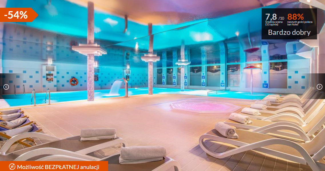 Najniższą cenę (189 PLN/2 osoby) za noc uzyskacie, decydując się już na 1-dniowy pobyt. Nawet wtedy będziecie mogli do woli korzystać ze strefy wellness oraz innych atrakcji przygotowanych przez hotel.