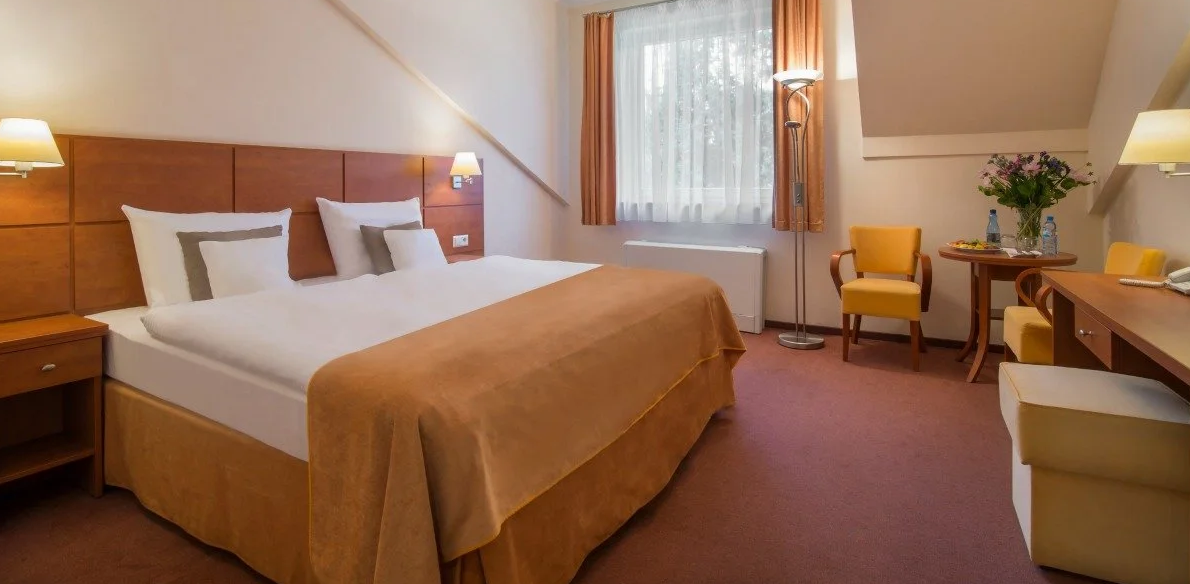 W cenie otrzymasz noclegi w komfortowo urządzonym pokoju oraz śniadania (w formie bufetów) i obiadokolacje (serwowane lub w formie bufetów). W pakiecie dostaniesz również nielimitowany dostęp do stefy wellness (m.in. z basenami, jacuzzi, sauną fińską i turecka, biczami wodnymi), bezpłatny parking, pobyt dziecka gratis, możliwość wypożyczenia roweru oraz kijków nordic walking, także Internet WiFi. Na terenie hotelu działa biblioteka oraz klub muzyczny.
