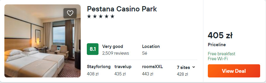 Możesz także rozważyć pobyt w 5* hotelu Pestana Casino Park z krytym i odkrytym basenem oraz wliczonymi śniadaniami. Każdy pokój wyposażony jest w klimatyzacje z funkcją ogrzewania, minibar, telewizor LCD oraz czajnik elektryczny. We wszystkich pomieszczeniach będziesz mieć zapewniony dostęp do sieci WiFi.