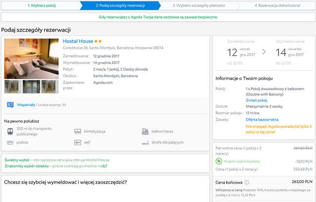 W Barcelonie proponuję Wam pobyt w Hostal House za 132 PLN/pokój za noc.