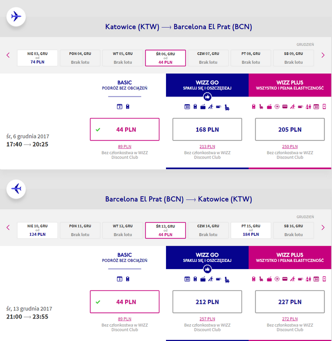 Przykładowe rezerwacje przelotów na 2 dni: