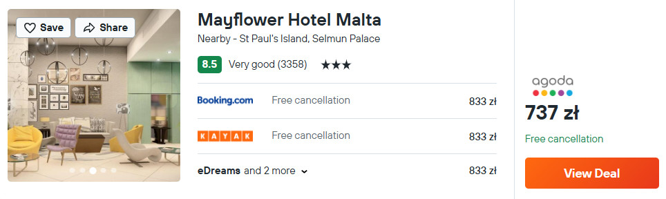 Na wyspie zatrzymasz się w bardzo dobrym 3* hotelu Mayflower, który znajduje się w miejscowości St Paul’s Bay, w odległości 5 minut spacerem od plaży Bugibba Perched. Z lotniska w okolice miejsca noclegowego dojedziesz autobusem nr X3 lub wypożyczonym autem.
