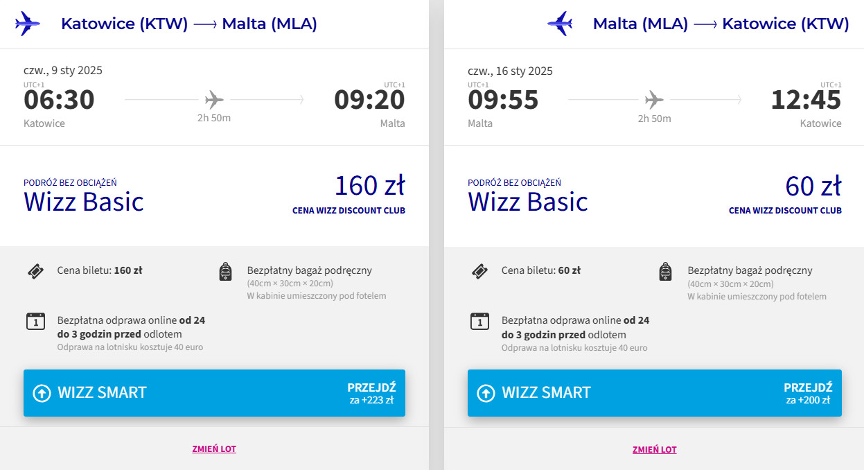 Na Maltę udasz się z katowickiego portu lotniczego w Pyrzowicach, w terminie 9-16 stycznia. W obie strony polecisz linią Wizz Air z bagażem podręcznym. Bilety w najniższej cenie dostępne są dla członków Wizz Discount Club. Chętni na loty bez WDC zapłacą nieco więcej.
